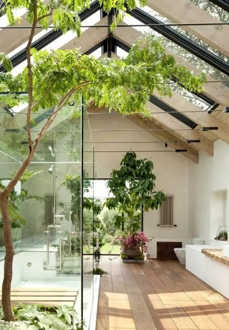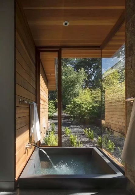 流動的空間之美,淋浴區在室內,而浴盆卻在不知不覺中延伸到了室外,兩全其美。