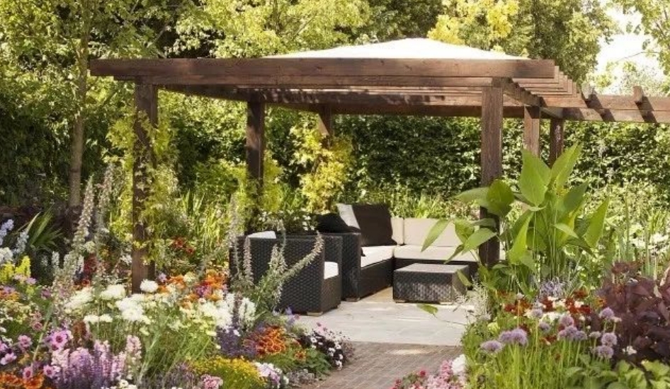 圍繞涼亭或廊架布置花境,給戶外休閑帶來一種浪漫的享受。鮮花盛開的時節,繁花錦簇的情境讓人賞心悅目,甜美的花香更讓人心曠神怡。
