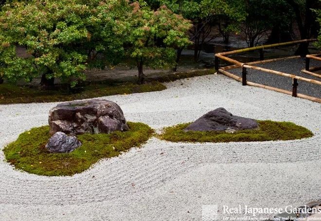 在日式枯山水的庭院中,常常使用白砂、碎石來模擬水流,營造禪意空間。