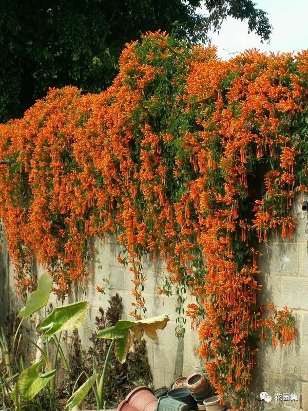 炮仗花也是一種應用很廣的藤本植物。很多人都很喜歡用炮仗花來裝飾露臺,炮仗花的花名由來,我覺得一定是因為它的花朵比較像炮仗,所以才得名的,橙紅色的鮮艷小花,配上又嫩又脆的葉片和莖蔓,真的十分亮眼,裝飾露臺活潑又喜慶!