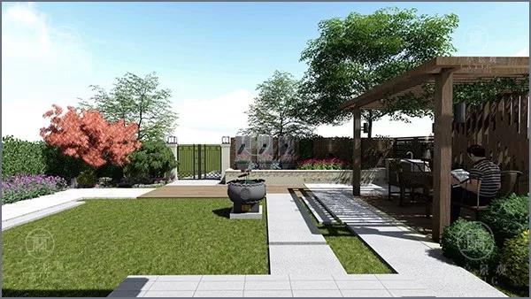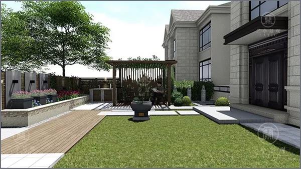 設計說明:整體設計上給人以清爽雅致之感,寬敞的布局讓人更加舒適。廊架及木格柵以簡約的造型為基礎,加上中式的荷花青石缸擺件,空間層次更加豐富,大而不空、厚而不重,凸顯庭院生活格調。