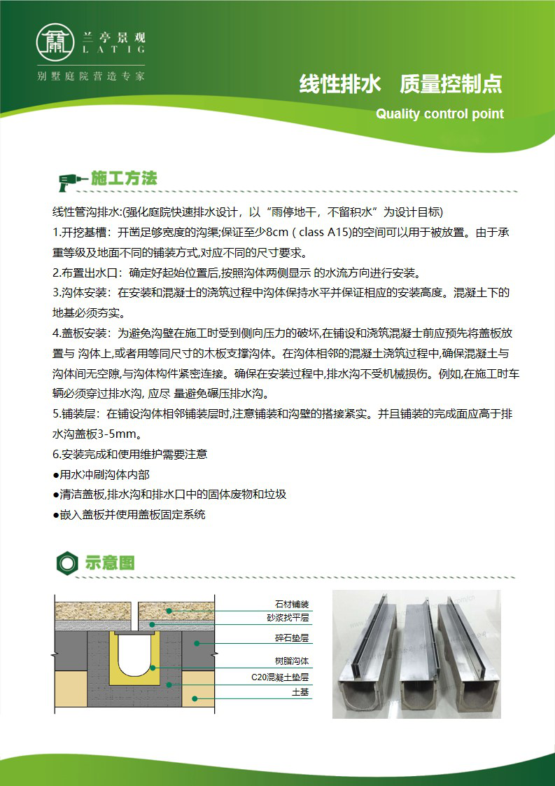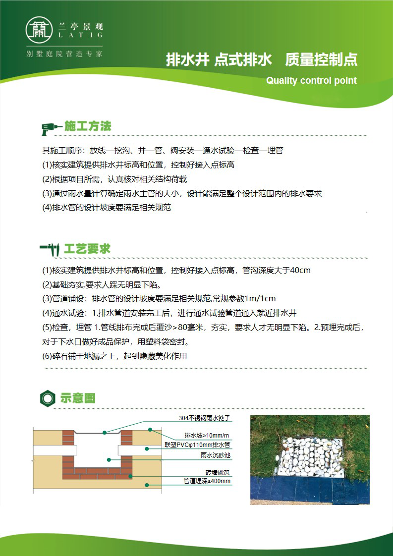 蘭亭景觀引進了專業(yè)水電工程設(shè)計,強化了庭院快速排水設(shè)計,以“雨停地干,不留積水”為設(shè)計目標,制定了非常詳細的《繪綠園林快速排水設(shè)計規(guī)范》,設(shè)計標準滿足降水量達到50毫米以上的暴雨環(huán)境。