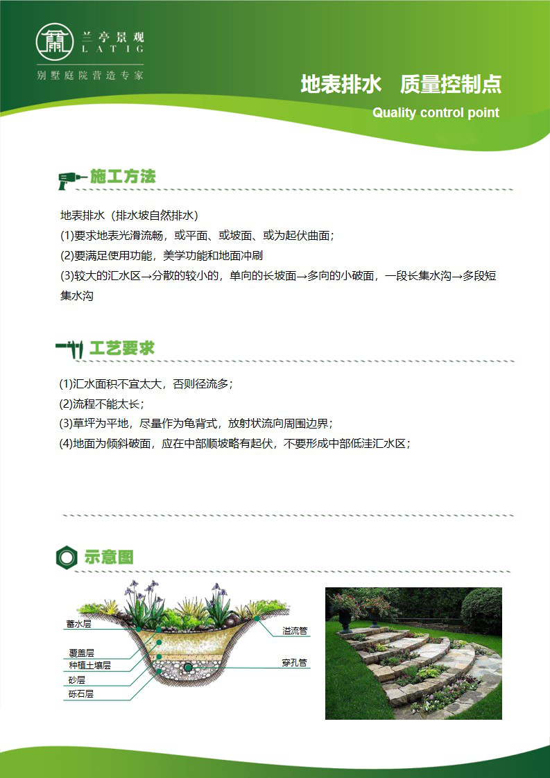 優(yōu)秀的庭院設(shè)計并不是想法天馬行空、效果圖花里胡哨,而是扎扎實實的用心設(shè)計,“好用,好看,好玩”這一直是蘭亭景觀的追求。包括庭院快速排水在內(nèi)的隱蔽工程設(shè)計,不僅僅是在考驗一個庭院設(shè)計公司的技術(shù)水平,更是考驗一個庭院公司的良知。