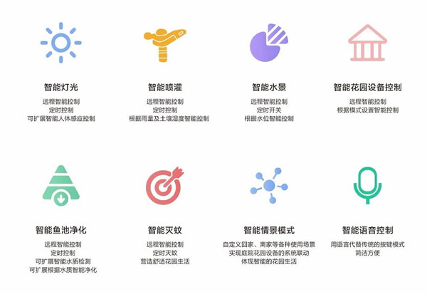 作為智能化庭院的核心“花園智寶”具有以下幾大板塊:智能燈光、智能噴灌、智能水景、智能花園設(shè)備控制、智能魚池凈化、智能滅蚊、智能情景模式、智能語(yǔ)音控制。