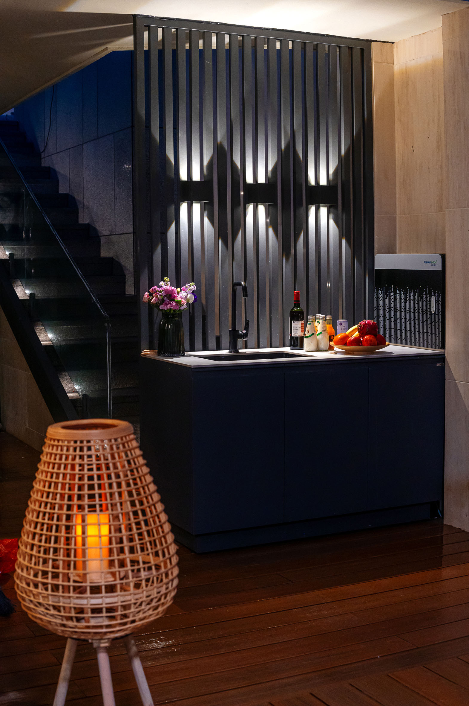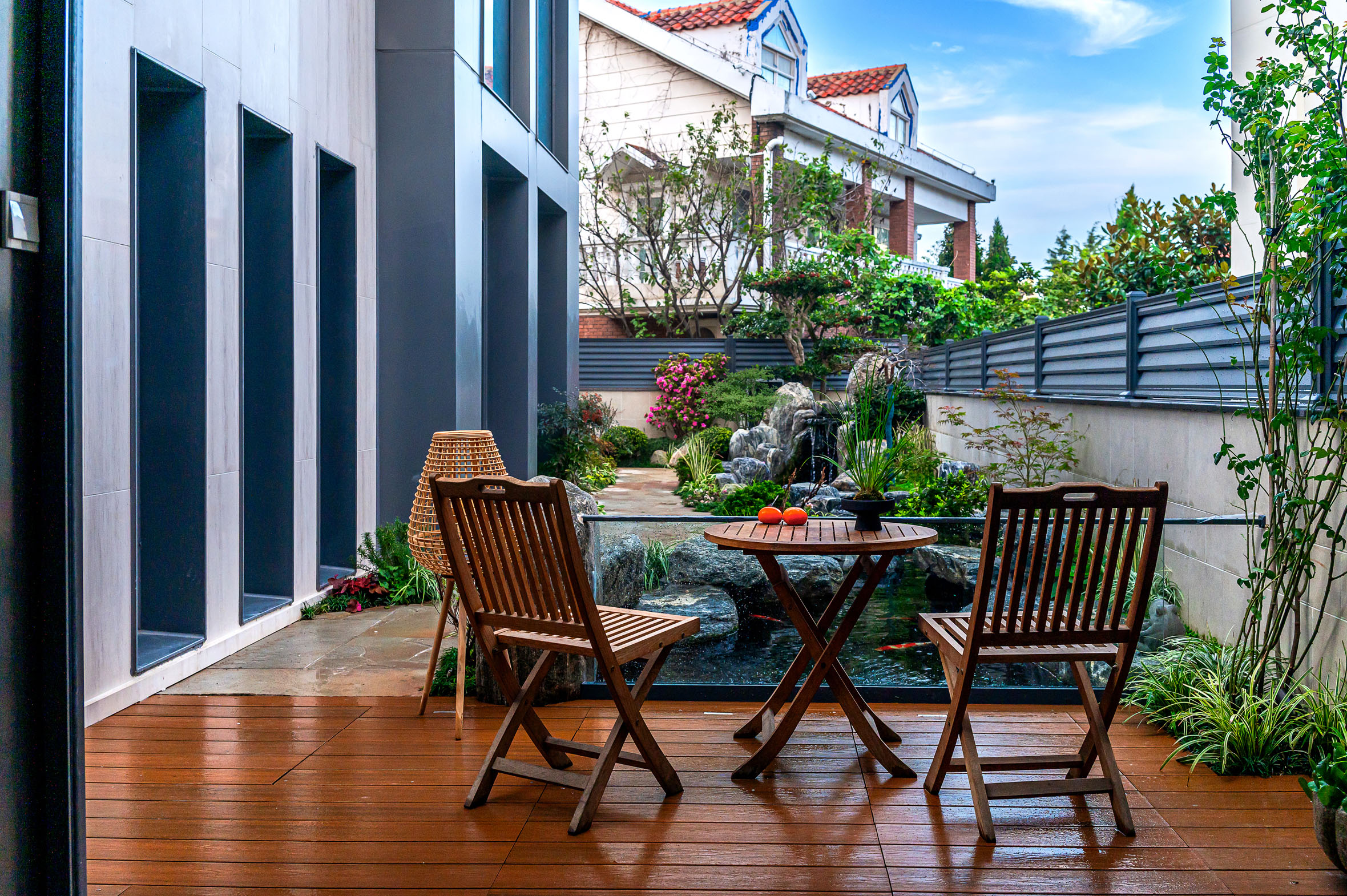 花園的茶室上方是一層的平臺,通過側院臺階下樓后即可到達茶室,也是花園的主要休閑區域,木平臺臨水而建,連接茶室和魚池。閑時與好友家人圍坐茶亭之中,煮茶品茗,風起花香,家就坐落在自然里,不必追尋那未知的遠方,精心布置好自己的一方庭院,散發著屬于“家”的溫情,享受這美好的花園時光。