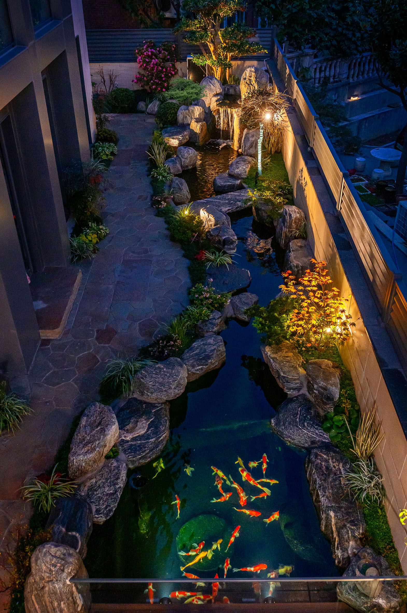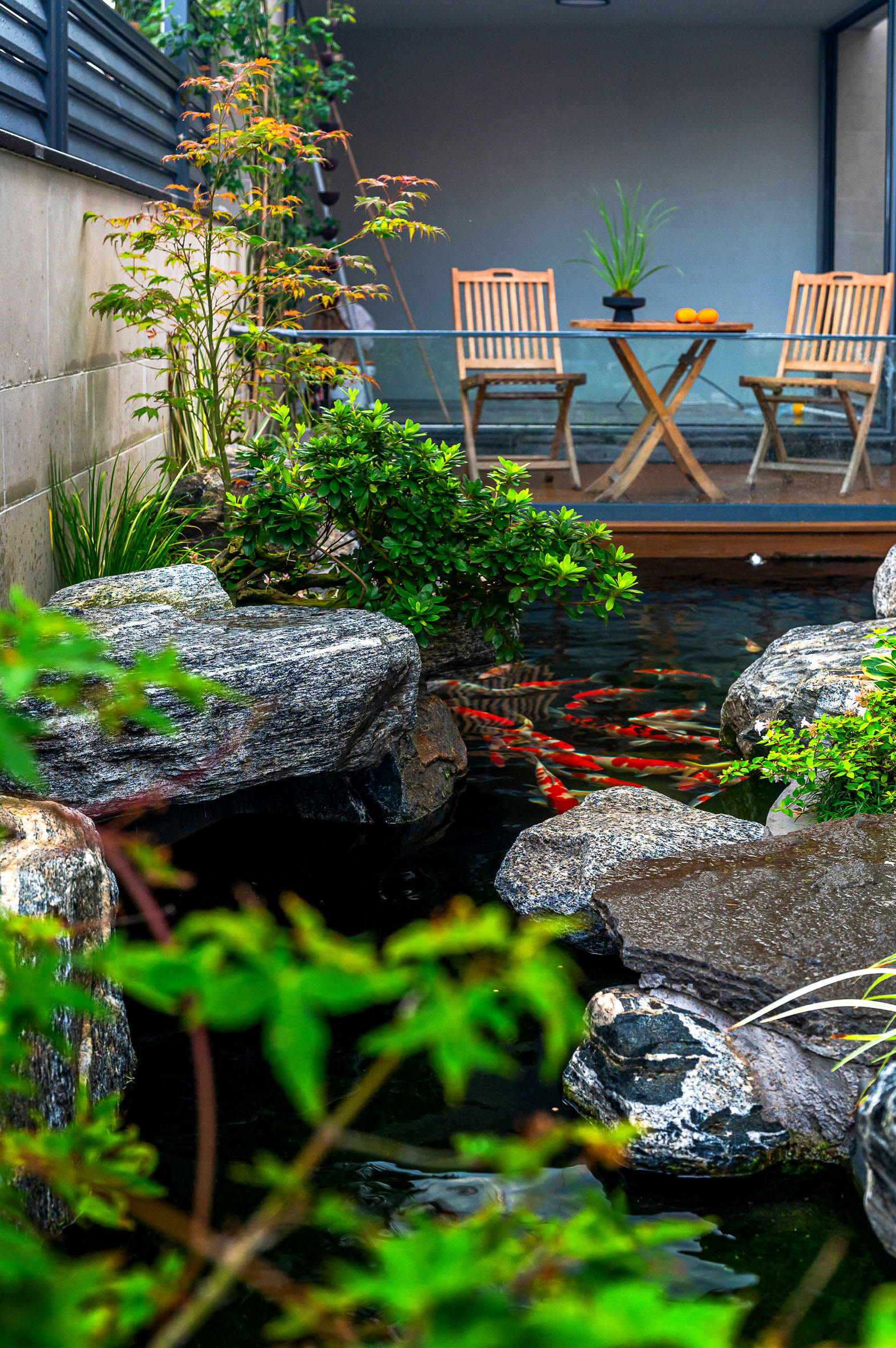 項目經過改造形成了較大空間落差,整體分為二層,一層主要作為通行和休息空間,主要以鋪裝為主,在入口和西南設置兩處休息區域,可以從不同的角度俯瞰一層花園的美景。負一層是打破了原有的結構和做法,原來的一層花園下挖,解決了原來建造的采光和通風等問題,讓建筑坐落在自然山溪花園景觀中。從室內的窗向外望去,如若一幅幅畫卷,假山流水,錦鯉清泉,感受潺潺溪流之清響,給予空間更多的自然意趣。讓生活置于風景之內,讓居者隨心所“遇”,皆是美好。人們在花園里可賞,可游,可居,打造實用而又富有詩意的花園,棲居詩畫里,樂享山水間。