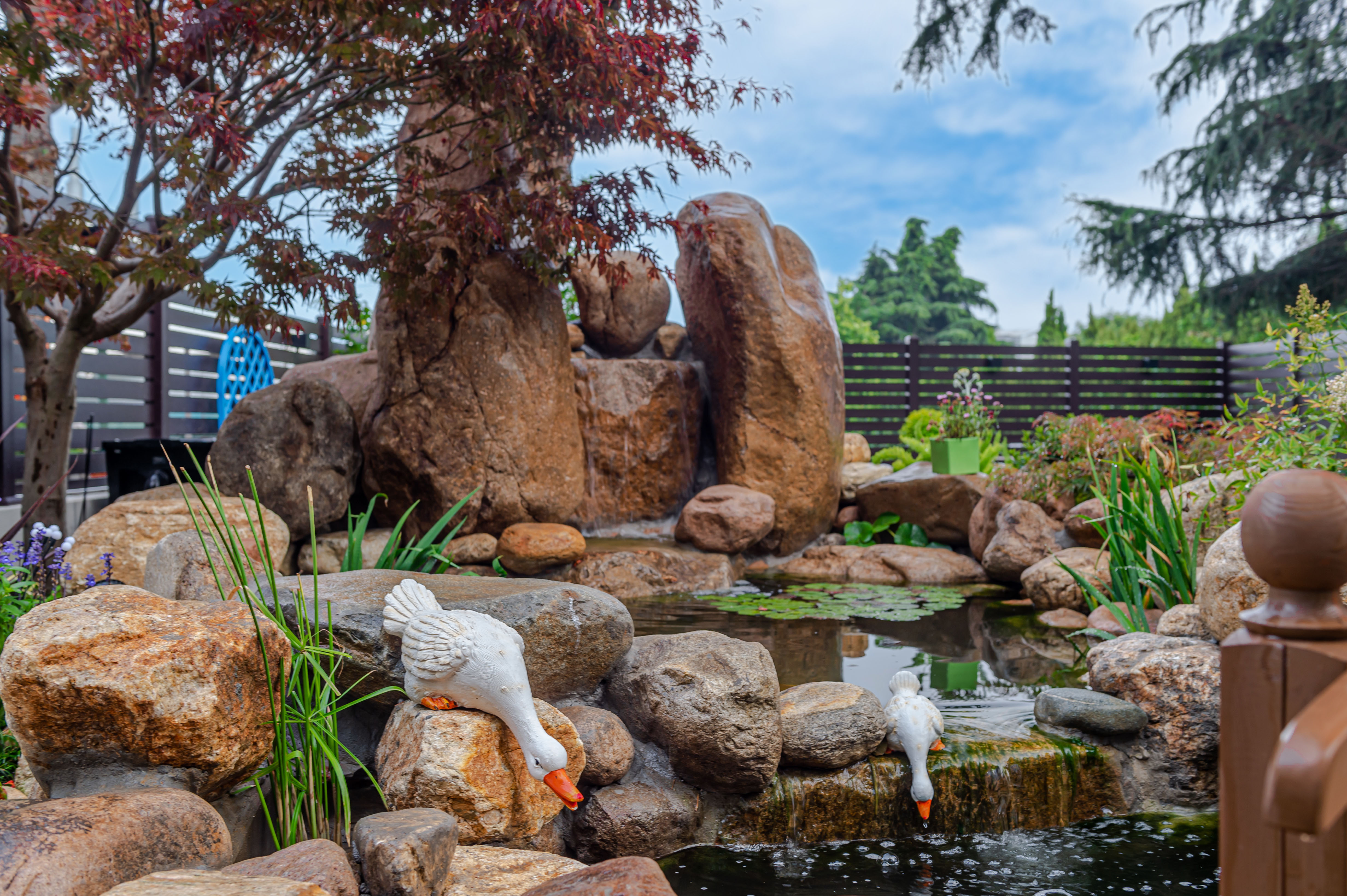 因男業主是理工科專業,不喜歡過于人工化的產品,不喜歡直線,喜歡自然曲線且柔和的布局,所以我們將花園分為三部分: 休閑平臺、錦鯉魚池及后花園。出戶設計成大區域的木塑平臺,在午后慵懶的陽光下,享受自然的清新,感受小院的溫馨。