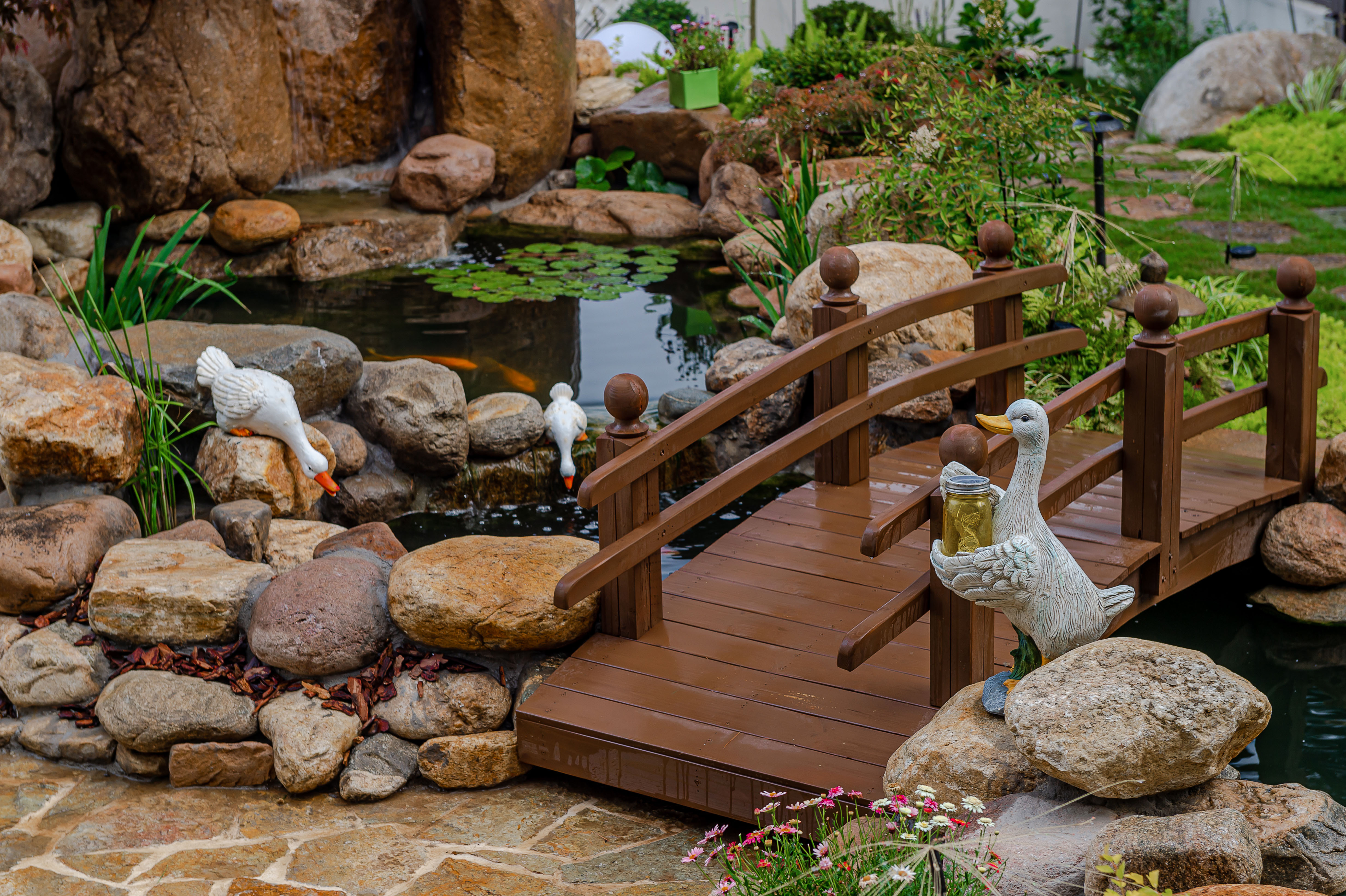 小橋流水,既有通行的作用也可更親密地與魚互動。清脆的水聲是寂靜中的一股清音,綿長動聽,與周邊地形設計相得益彰,高低錯落,光影重疊。