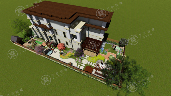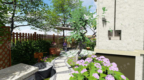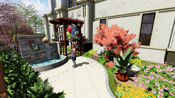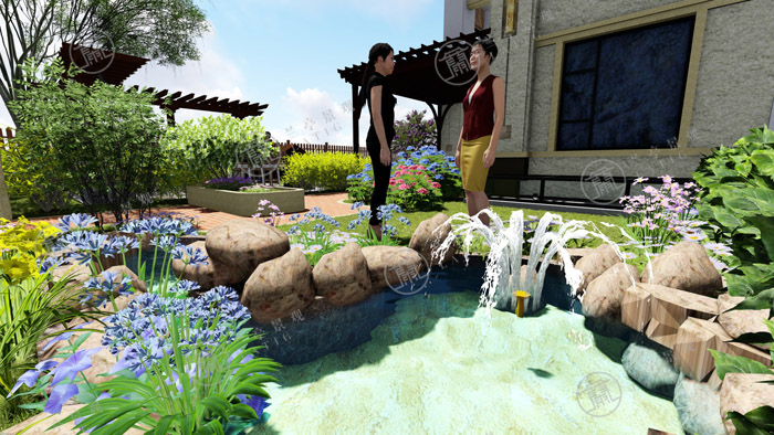 2.東方具有木氣,喜木喜水,宜布置水局。設計師在庭院的東南角布置一處自然水景,與花草結合,富有生氣。
