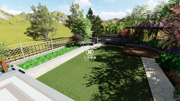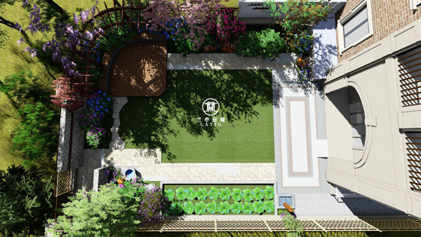 設計師說明:別墅位于較為安靜的地區,周邊環境自然景觀舒適。花園占地面積約160平方米。花園設計主要滿足園主的功能的要求,主要分為出口平臺區、休息區、陽光草坪、菜園等。平臺區簡約開闊連接草坪,遠處對景墻和廊架休息區展現眼中,吸引人們沿著碎拼園路漫步過去。陽光草坪是個靈活的空間,可以為小孩玩耍、家人聚會等活動提供場地。休息區主要由廊架和植物組成,在一片綠蔭、鳥語花香下,體驗浪漫的休閑時光。