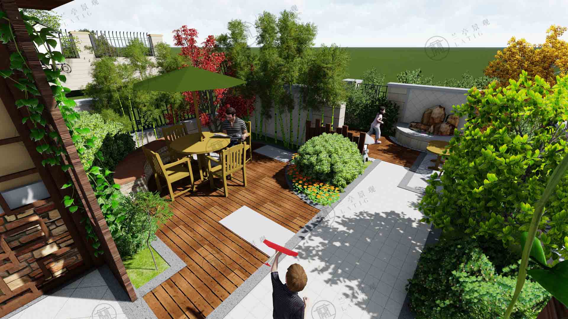 在S宅的改造上,從外圍到私人空間,我們提出了一整套改造方案。根據(jù)戶主的要求,把建筑入戶大門(mén)建造的更美觀大氣;增設(shè)小疊山水景,旁邊設(shè)置別致的兩人座,并在原有鋪裝的基礎(chǔ)上增加木制作,水、木、石和諧搭配;在景墻后面構(gòu)造出優(yōu)美空間,木質(zhì)甲板上擺放餐桌餐椅;弧形坐凳讓人身處綠植懷抱,植物的配置也重點(diǎn)突出紅色,萬(wàn)綠叢中一點(diǎn)紅。