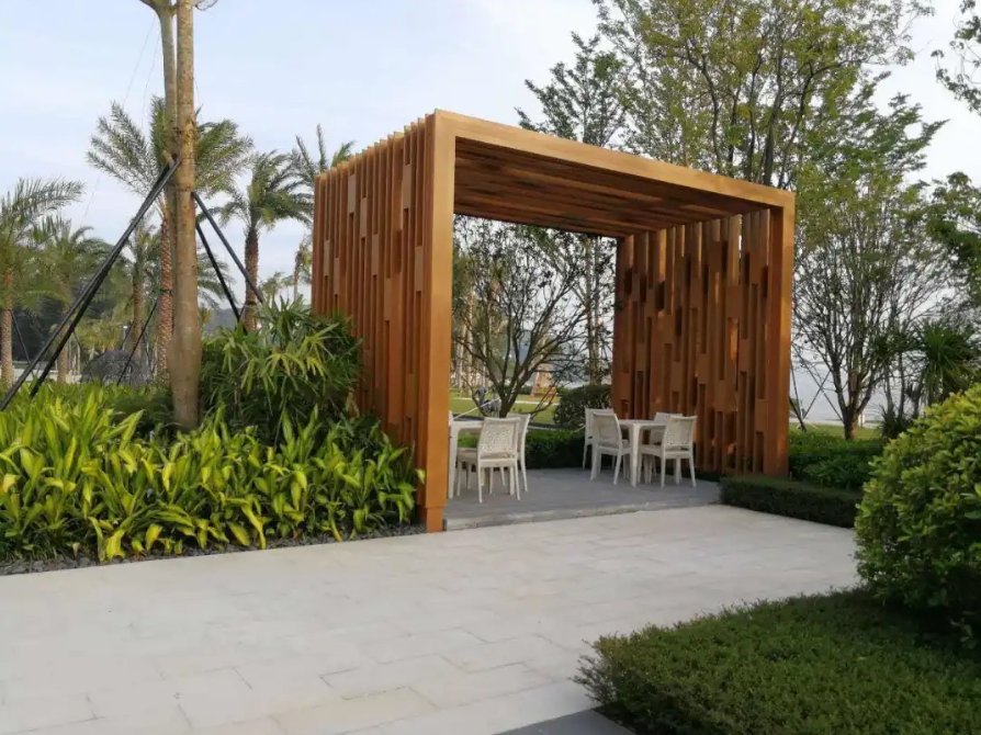 在庭院露臺、花架、走廊、廊亭……等空間中,通過選用防腐木進行設計搭配,營造出舒適的空間氛圍。同時,搭配各類花園植物,互相映襯,打造出具有質感和品味的花園。