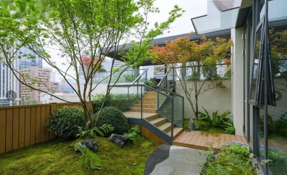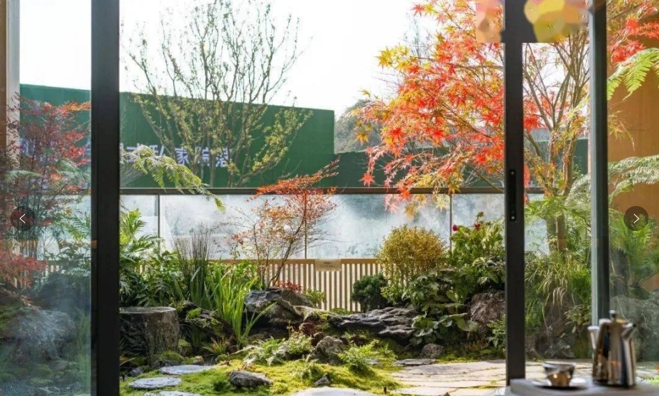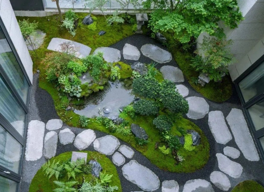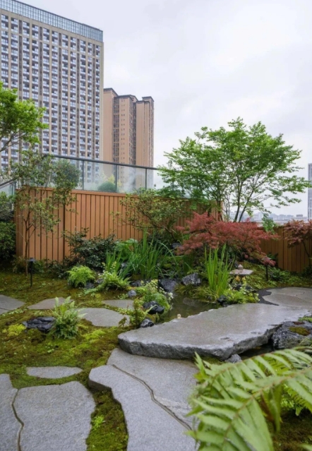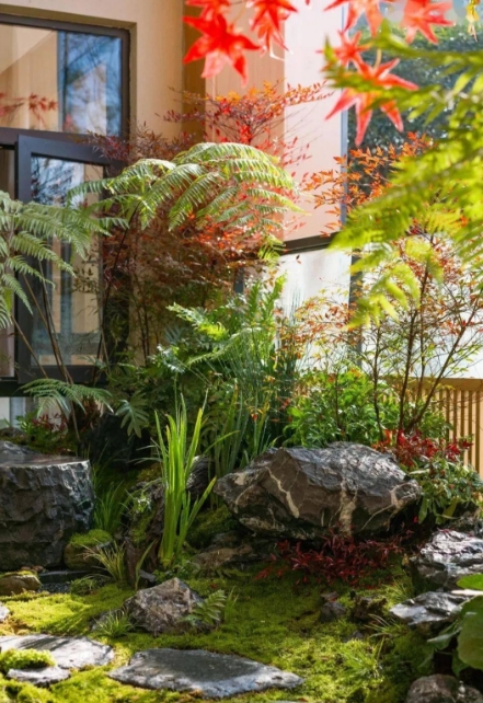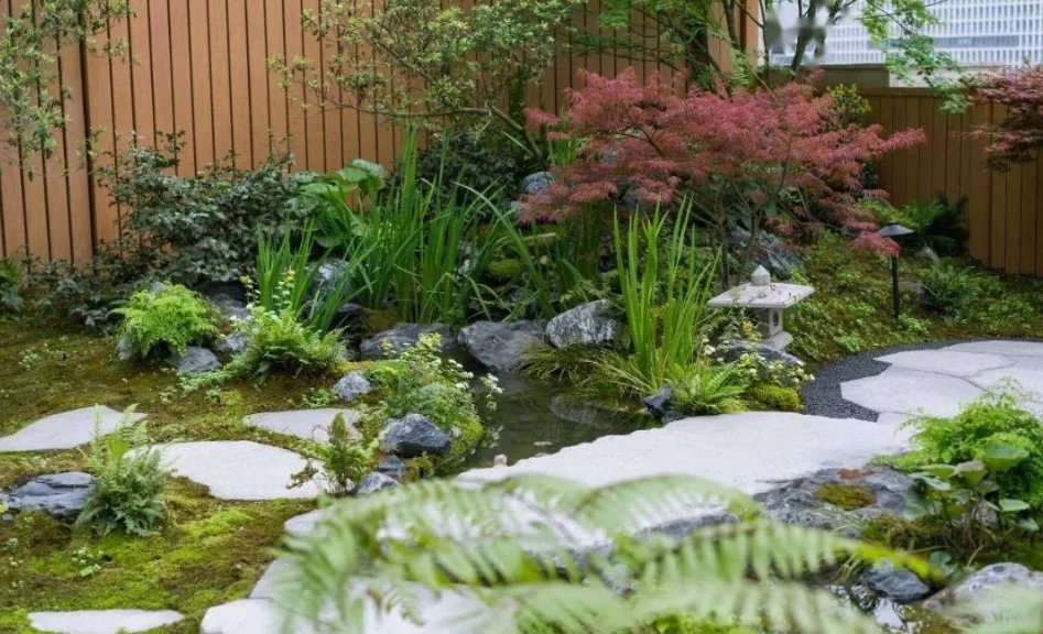 設計采用日式枯山水的意境,展現出自然禪意感,再與現代日式簡約的構筑物、景墻及小品結合。植物配置也是以日式庭院造景手法為主,運用蕨類、日本紅楓、大吳風草等植物營造出獨特的景觀。