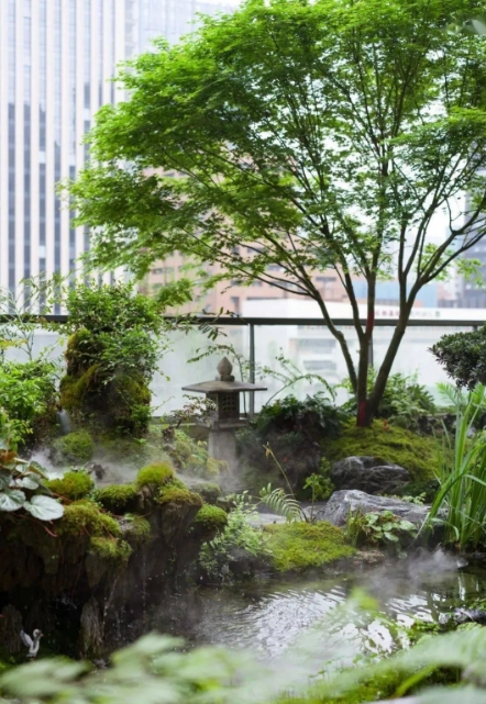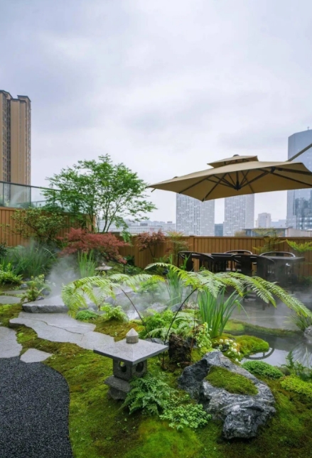 中心庭院精心打造了一座浮空島,帶來空間的起伏錯落,結合大面積的苔蘚和蕨類植物,打開造霧機后,如同仙境般的存在,讓干涸之心,重獲生機;讓疲憊之身,遁入自然之境。