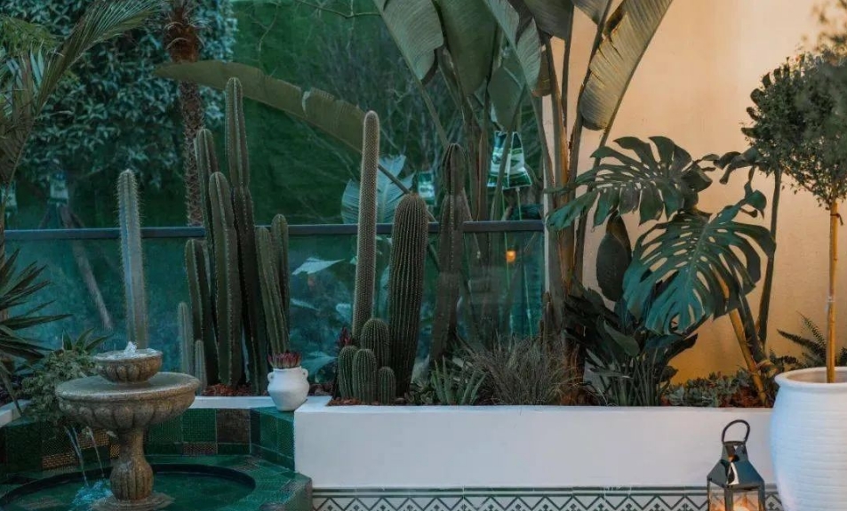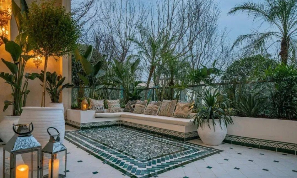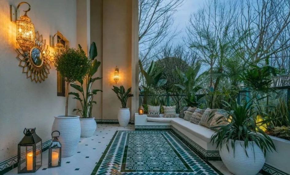 通過陽臺地磚、照明燈具、沙發等硬軟裝全面打造一款摩洛哥風格的花園,外圍的植物采用耐旱的旱生植物與部分室內風格植物結合,創造摩洛哥的異域風情,足不出戶可以享受在國外度假的感覺。