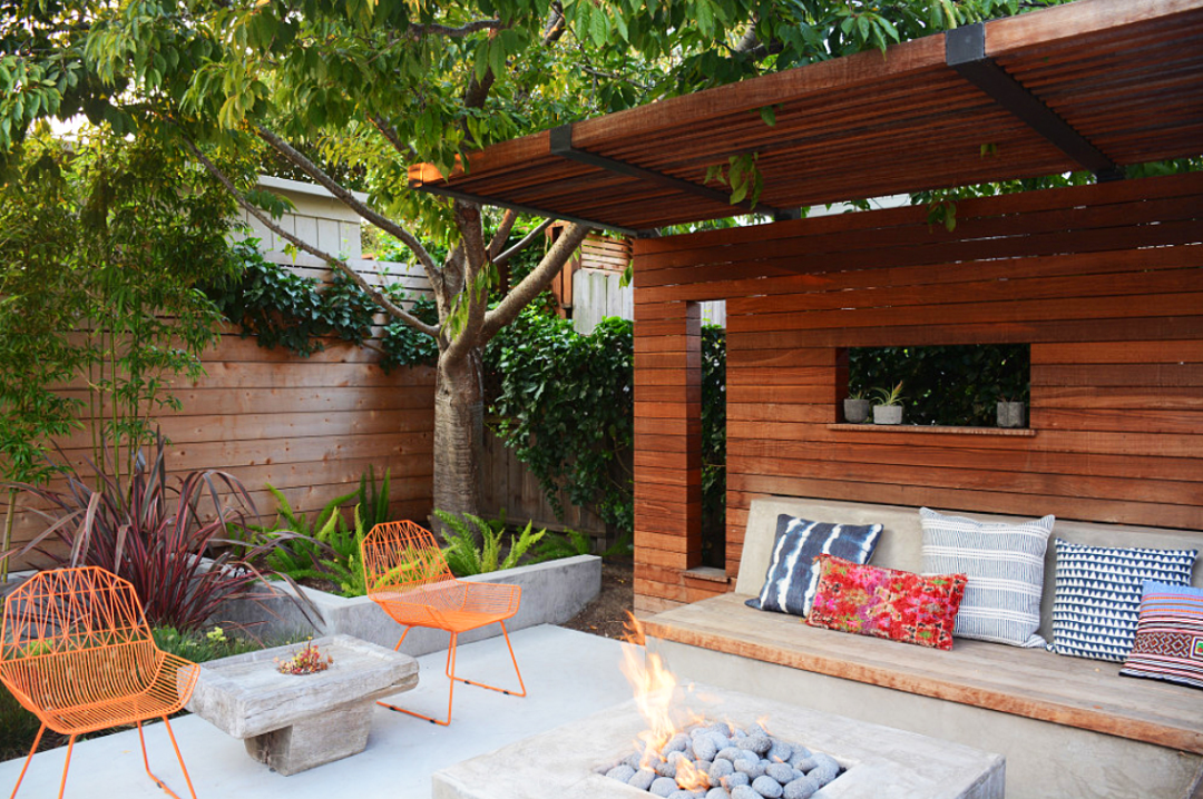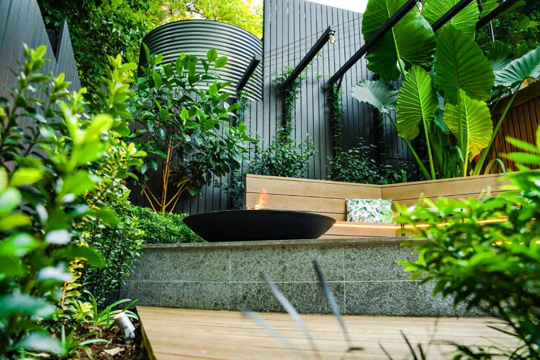 這個花園的設計布局非常的完整精致,功能分區明確,花園滿足了居住者的多方需求。庭院以灰色調為主色,主要材質選用了防腐木、鋼結構作為主要材料。