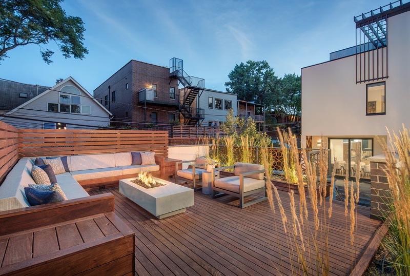 這是一個兩層的屋頂天臺花園,一層二層都是屋頂,一層設計了一個就餐區域一個沙發休息區域,二樓設計了一個篝火休息區域。