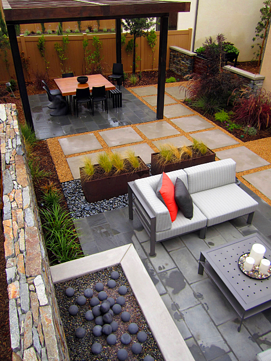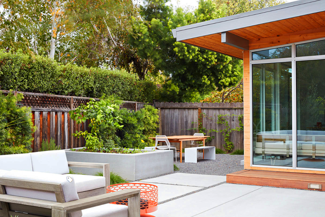這是一個偏長方形的院子,但是設計師并沒有做順勢而為的設計,設計師選擇切割了分區,采用斜切的方式把庭院布局做得更加豐富了,避免了“假大空”,整個空間看起來不是單純的長方形,避免了刻板布局。
