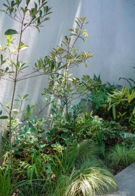 株型與葉形方面,多用天生具有線條感的植物(如鳶尾、紫嬌花、苔草、棕竹等)來(lái)呼應(yīng)庭院清秀而硬朗的格局。避免選用容易下垂的蔓性植物(如花葉絡(luò)石、花葉蔓長(zhǎng)春等),防止其破環(huán)連續(xù)統(tǒng)一的花壇邊界。
