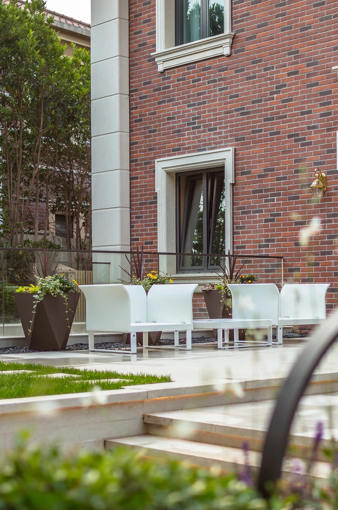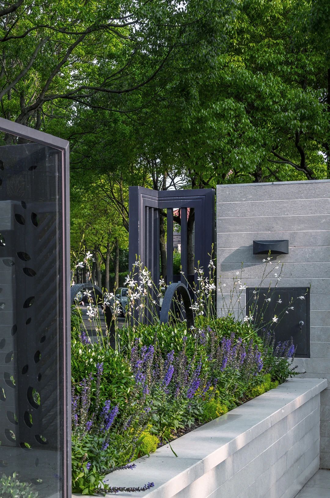 入口的位置在整個花園里算是下沉空間,也是單獨的一個區域,入戶門和墻面的裝飾燈都是設計師特別設計的,采用鋁合金烤漆材質,經久耐用。入口的右手邊是一排薰衣草花鏡,電箱的位置也相對隱藏了起來。