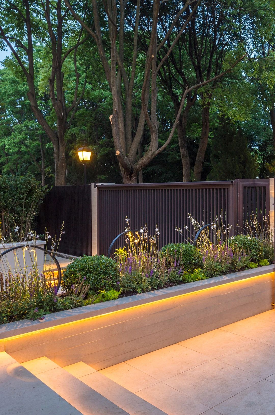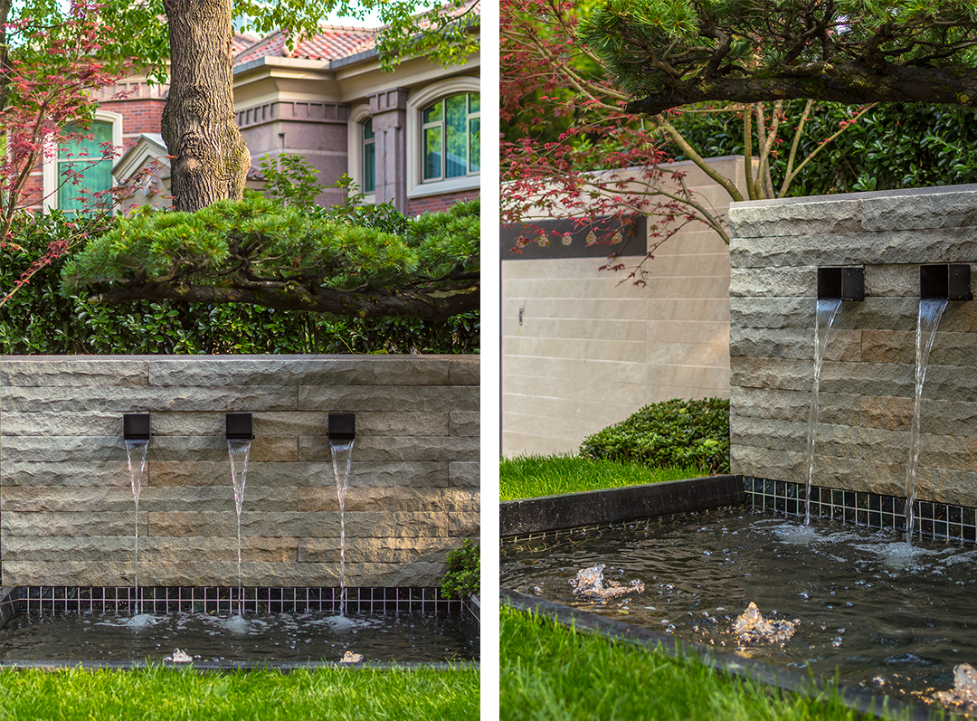 整個花園的亮點很多,但是這塊背景墻晚上的燈光真的是很吸引眼球,前面的小水景給這個區域增加了趣味性。