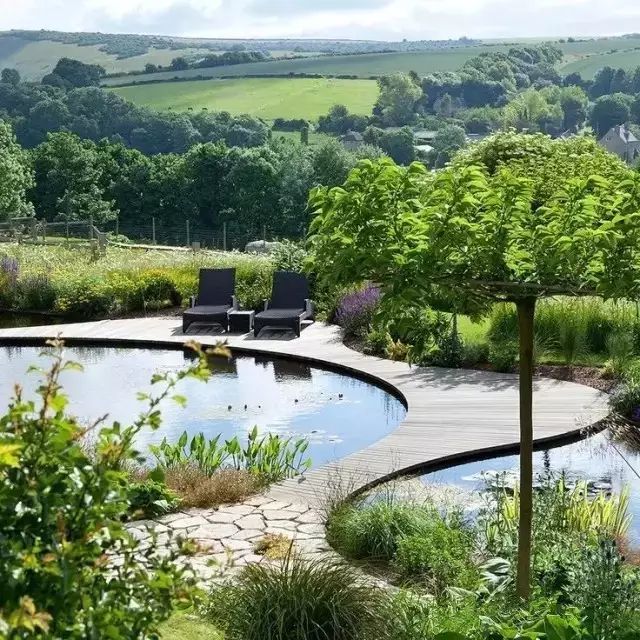 水景的駁岸用曲線處理,凹凸相間,意象幽邃,而且池岸線伸展自如,人行其上,花樹扶疏,曲折有情,也豐富了曲岸的層次。青島花園設(shè)計公司——蘭亭景觀為您介紹。