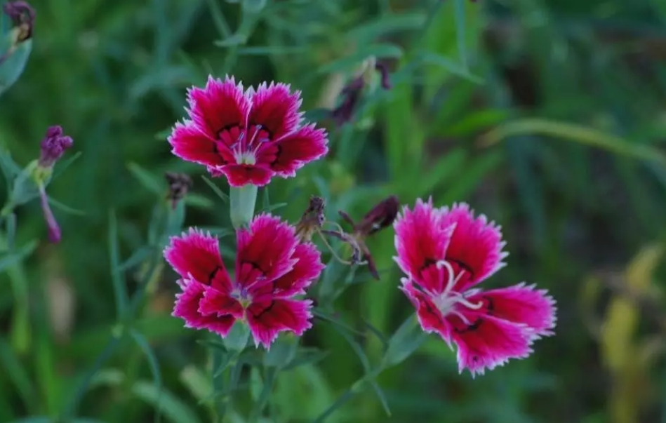 石竹是最典型的切花鑲邊植物,色彩繽紛,花期較長。植物花期:4~10月,集中在4~5月園林應用:花色有白、粉、紅、粉紅、大紅、紫、黃、藍等,變化多。園林中主要用于花壇、花境、花臺和盆栽,也可用于巖石園和草坪邊緣鑲邊,大面積成片栽植時可作地被材料。