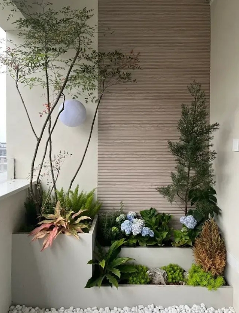 其次,巧妙的設計可以增加陽臺花園的層次感和美觀度。在陽臺的一側安裝簡易的花架或吊盆,讓植物在垂直方向上也有生長空間;使用不同高度的花箱或花壇來擺放植物,形成錯落有致的視覺效果;甚至可以在陽臺上懸掛一些小巧的裝飾物,增添趣味?。