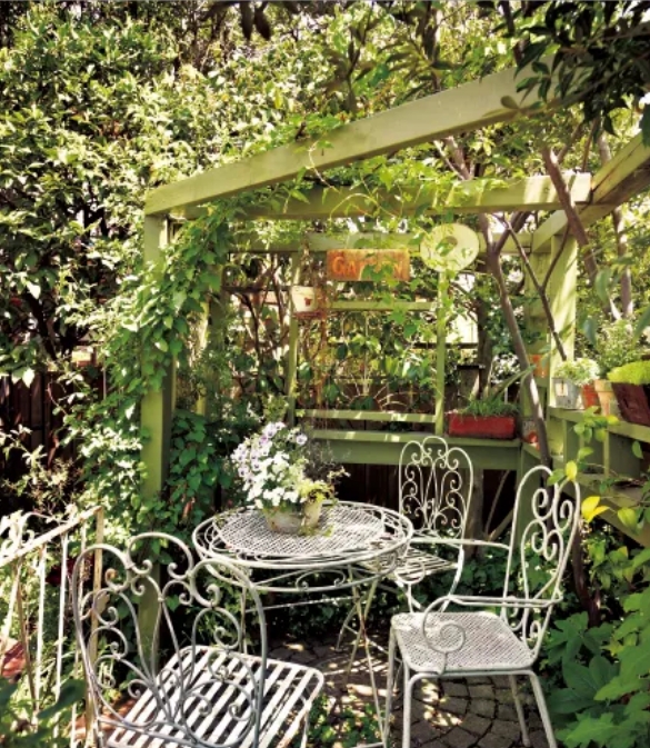 通過控制花園中使用的色彩數(shù)量,可以避免讓花園看起來雜亂無章,空間狹小的花園更應如此。例如,將藤架、長椅和花園桌椅都統(tǒng)一成沉穩(wěn)的綠色調(diào),讓這個區(qū)域看起來更有整體感。