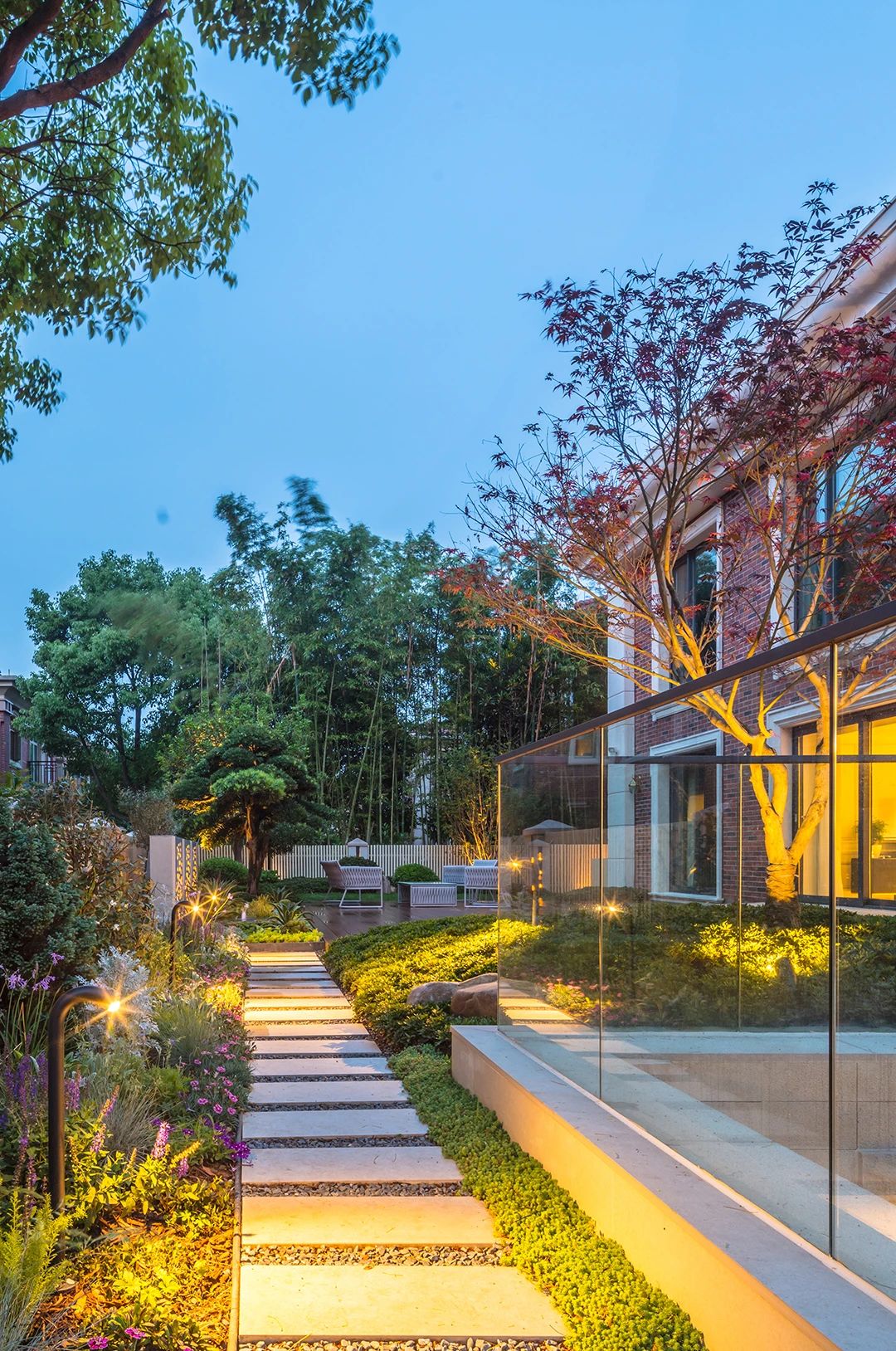 下晚的時候,打開燈光,整個花園的氣氛都會被烘托出來,每個地方,都設計了不同的光線,照射出一個溫暖浪漫的環境。不要小看這些星星點點的小光源,這才是設計師的用心之處。