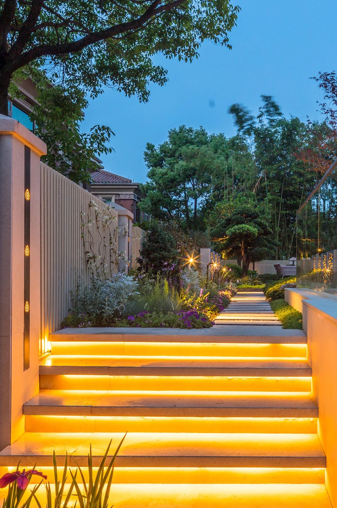 入口的位置在整個花園里算是下沉空間,也是單獨的一個區域,入戶門和墻面的裝飾燈都是設計師特別設計的,采用鋁合金烤漆材質,經久耐用。入口的右手邊是一排薰衣草花鏡,電箱的位置也相對隱藏了起來。