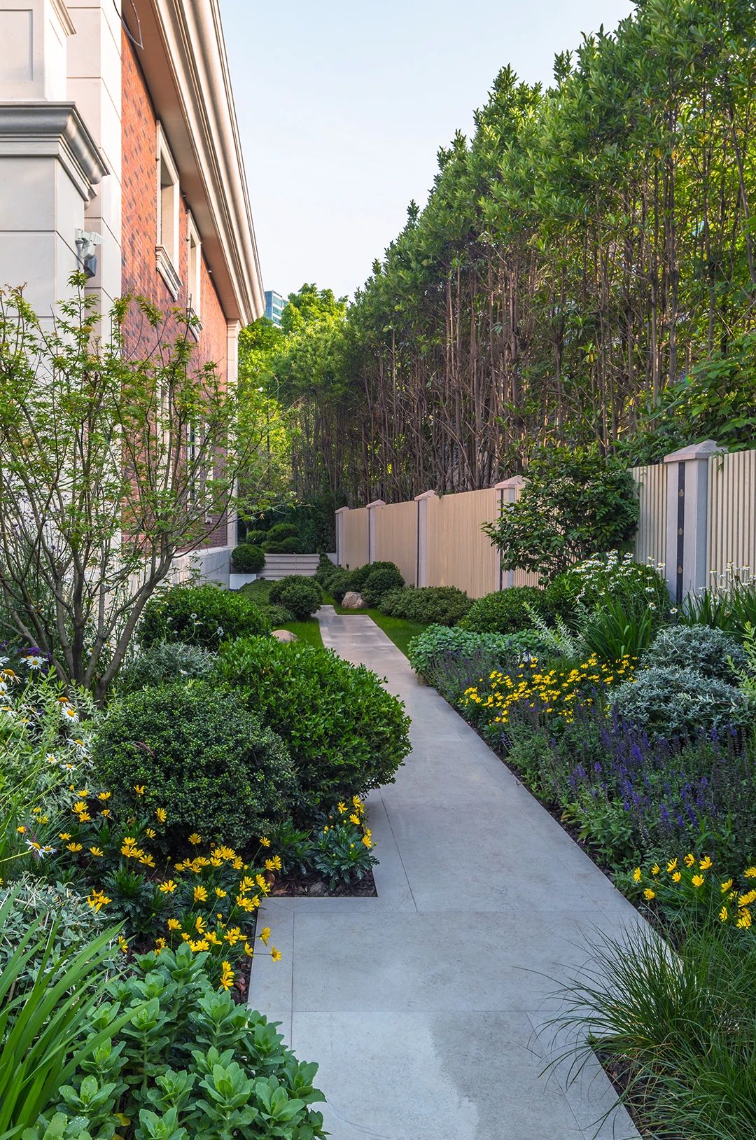 不同的路,采用了不一樣的方式表現,有町步,也有平坦的石板路,旁邊是專業的花境設計師搭配的植物,讓業主可以在不同的季節都感受到春意。濰坊別墅庭院設計公司——蘭亭景觀為您介紹。