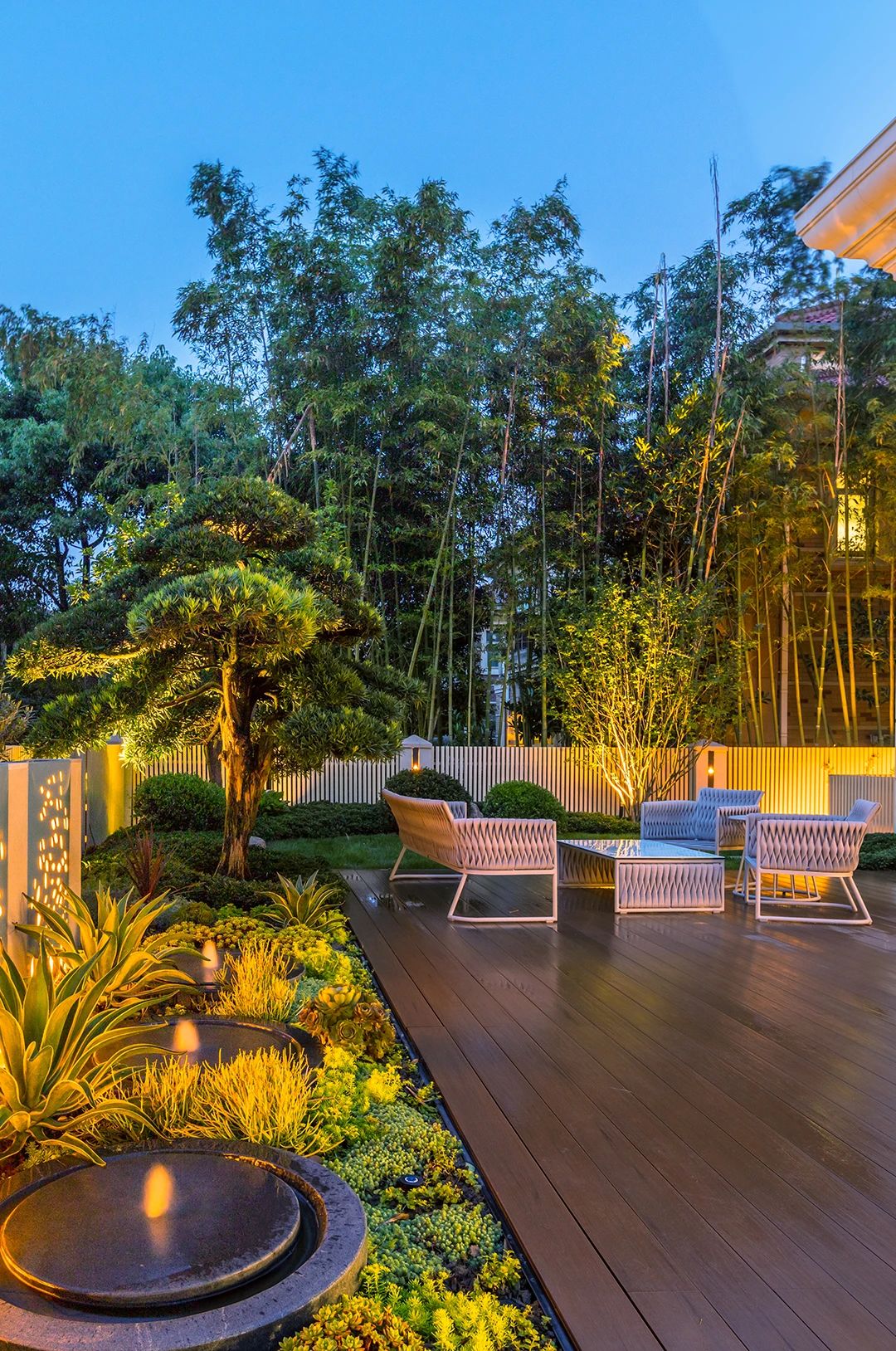 整個花園的亮點很多,但是這塊背景墻晚上的燈光真的是很吸引眼球,前面的小水景給這個區域增加了趣味性。