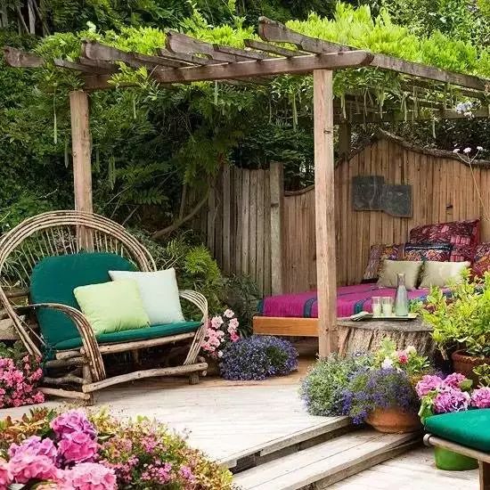 如使用一些榆木制成的保持其自然本色的戶外家具,滕柳編織成的戶外沙發,草編的地毯,藍印花布的桌布和靠墊,廊架上可再掛幾個風箏、掛瓶、紅辣椒、玉米棒等具鄉土氣息的裝飾物。用有節木材、方格、直條和花草圖案,以樸素的、自然的干燥花或干燥蔬菜等裝飾物去裝點細節,營造一種樸素、原始之感。