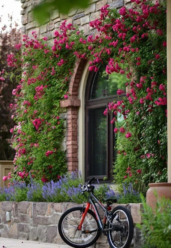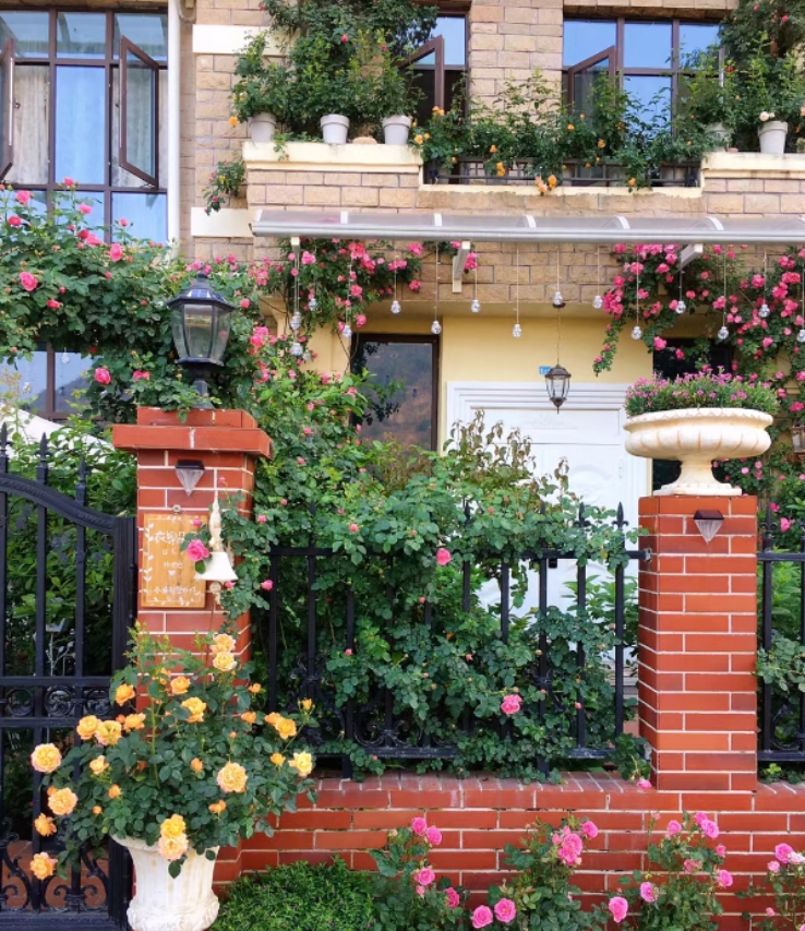 人工牽引攀緣玫瑰沿著柵欄布置或利用攀緣玫瑰弱化難看的鐵絲網(wǎng)柵欄。