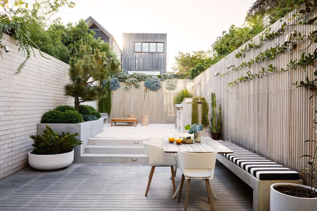 為了避免空洞,可以采用組合型鋪裝來搭配,例如石板+木平臺/小面積草坪,硬化面積建議不宜超過場地的70%,否則會帶來生硬冰冷的視覺。余下的空間作為綠化面積搭配,平衡視覺,同時種植一些低維護的綠植是最適合的。