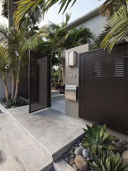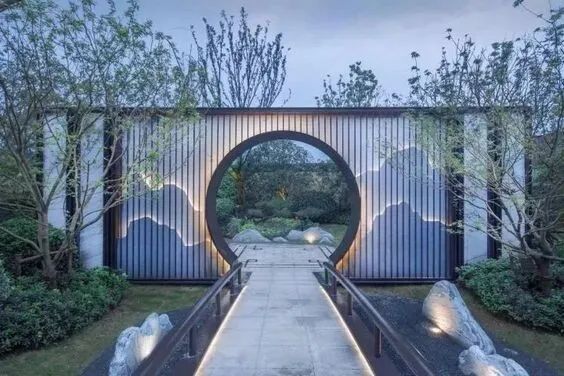 其次考慮風格是否和整座庭院相搭配,以達到美觀的視覺需求。比如現代風多用可塑性較強的鋁制大門;日式風則多用木制大門或半圍的鋁制鐵門等。最后可以在門頭處適當地造景,種植一些常年生植物,或擺一些風水小品,營造豐富的視覺效果。