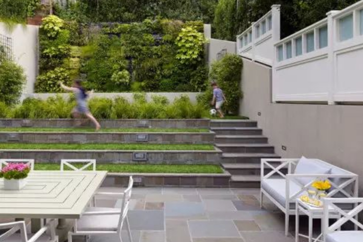 如果后花園是坡地,很好的一個獲得更大空間的形式就是,打造一個臺地式花園。當然這樣成本自然就會高。因為,這樣的基礎結構必須夠結實,才能讓你安心使用這樣一個花園空間