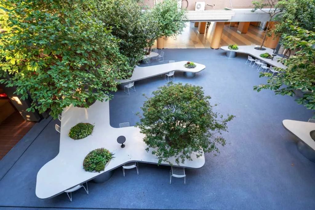 作為整個花園最重要元素的樹桌,看似自由隨機的外型,實際上也是分析推導出的:規模按照一個40人班級的課桌尺度演變而來;定位依照樹干點位環繞放置;間距與空隙則與周邊建筑接口與通道對接。
