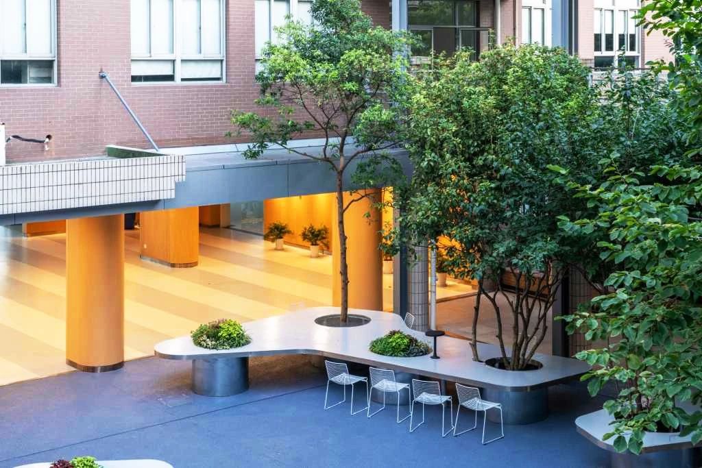 改造最大程度的消除了這片花園與四周的隔離,建立了室內室外一體化的空間體系,師生們可以自由地從各個方向無障礙地進入。桌面上還內置了花草盆景,創造出與樹為鄰的學習交流空間。樹桌能夠提供一堂特別的室外課程。由于與一樓門廳相連,也可滿足學校層級一些非正式的、輕松的小型交流活動。