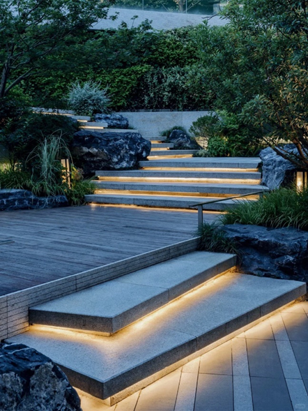 庭院的臺階照明,要達到隱蔽燈具,見光不見燈的效果。臺階燈的形式和布置方法有很多種,可以將臺階燈鑲嵌在側墻,也可以鑲嵌在臺階側面,既能方便行走,也起到了很好的裝飾作用。