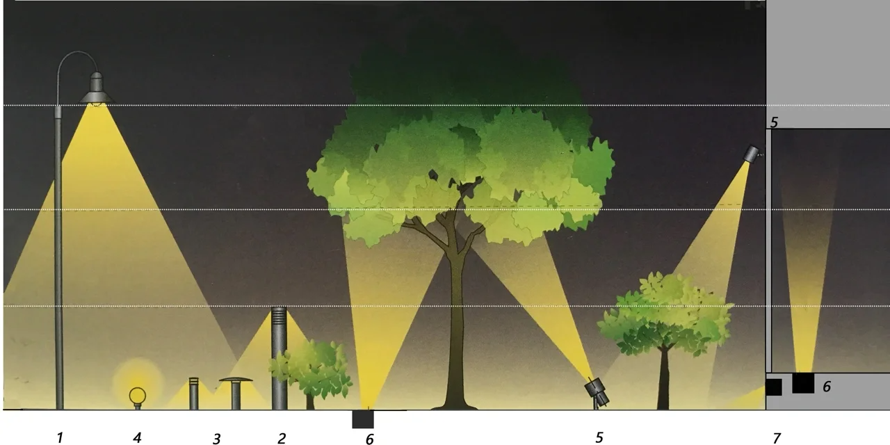 涼亭或景墻等建筑景觀可以用投光燈強調其立體感,達到用影繪畫的效果。對柱子或景墻做裝飾性照明,具有導向性,限定夜間活動空間。涼亭等休息區域做氛圍照明,提供舒適柔和的燈光環境。