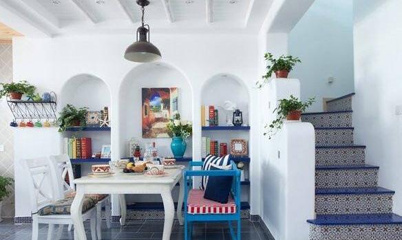 地中海風格之所以備受我國人喜歡就是因為它純美的色彩組合。其中比較有地域性的三種典型的顏色搭配就是西班牙蔚藍色的海岸和白色沙灘;希臘的白色村莊與沙灘和碧海、藍天融合成一體,還有就是北非特有的沙漠、巖石等等。