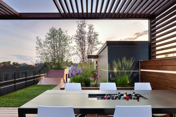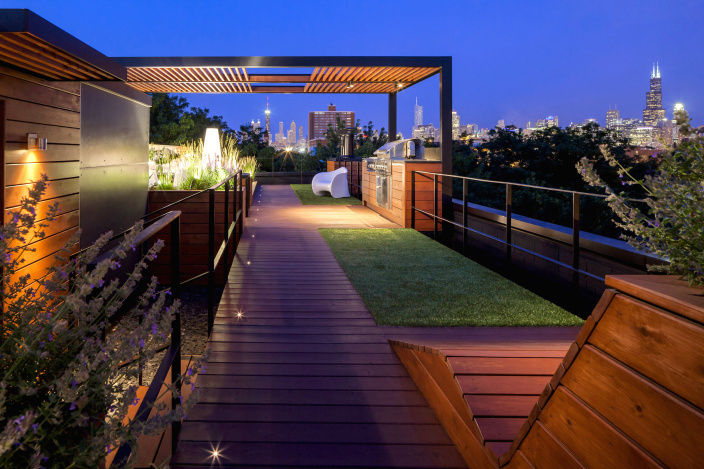 定制的LED燈條水平安裝在墻上,為一個藝術和動感的夜晚場景。人造草坪為娛樂提供了豐富的空間,并與耐旱植物進行了鮮明對比,因為它們在城市屋頂甲板微氣候中茁壯成長。