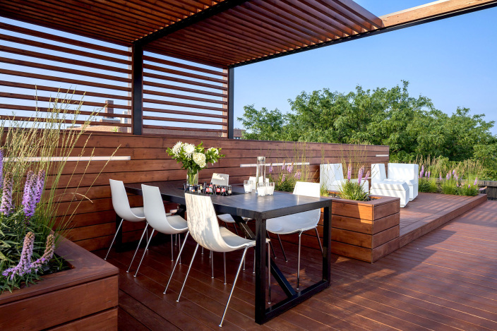 整個屋頂花園設計包括日光浴平臺、廚房、用餐空間、游戲草坪和觀景平臺。