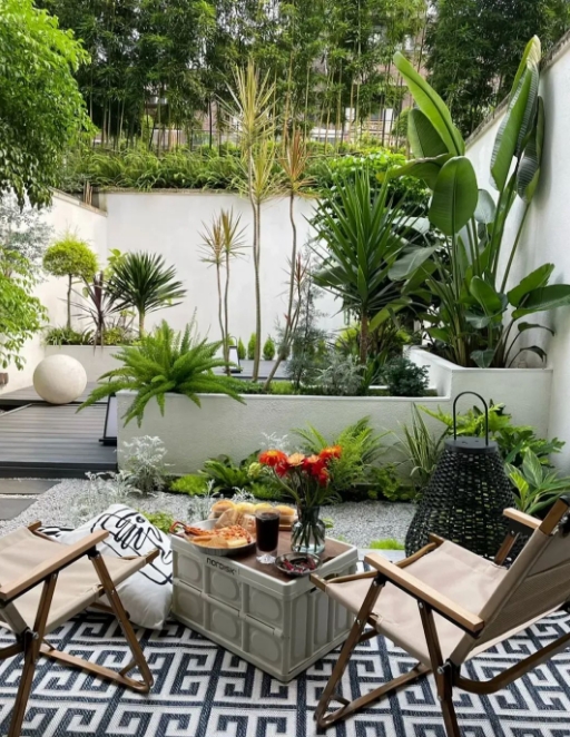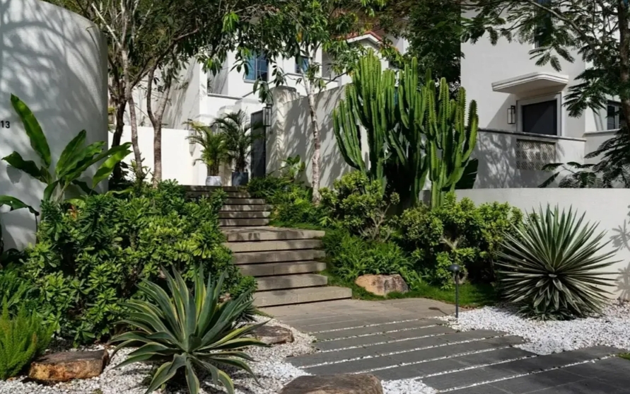 綠色植物也是突顯熱帶風情關鍵的一筆,尤其以熱帶大型的棕櫚樹及攀藤植物效果最佳。低矮灌木和攀藤植物相互配搭的立體綠化,也是目前常見的做法。木平臺和水景是必不可少的花園元素。