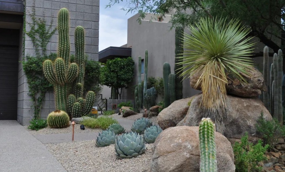 花園的沙漠風格和地中海風格有幾分相似,主要表現的是熱帶干旱地區的景觀特色,花園植物類型相對比較單一,以仙人掌科植物形成的規模效應為最大的魅力,搭配建筑和地面截然不同的色彩呈現出鮮明反差,很有畫面感。青島別墅庭院設計公司——蘭亭景觀為您介紹。